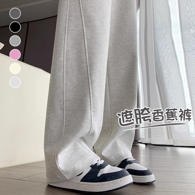薄い灰色のバナナの運動の衛のズボンの女性の2025新型の春秋の金の高い腰の垂直感のカジュアルなまっすぐな筒の曲がった刀の広い足のズボン
