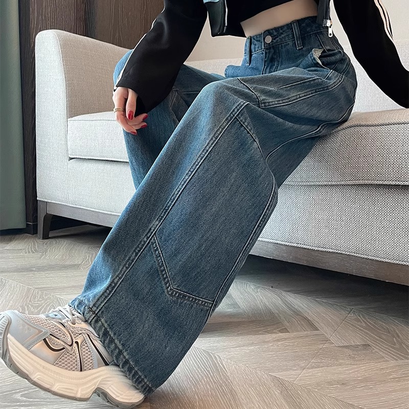 レトロなつなぎ合わせの曲がった刀のズボンの女性2025年の春の服装の狭い版のまっすぐな筒の工装の鎌のズボンのギャルの広い足のジーパンの女性