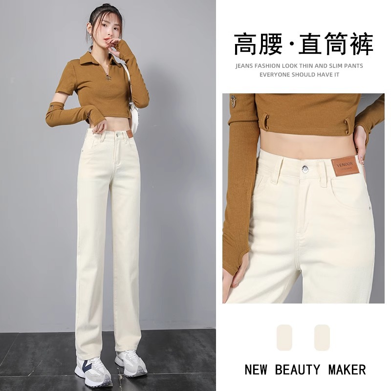 ベージュの白いストレートジーンズの女性の冬のベルベット2024の新しい高腰の狭い版の9分の小さい子のパイプのズボン