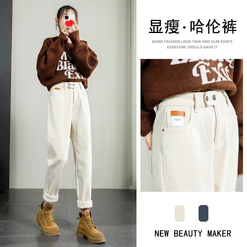 白いハーレムジーンズの女性2025春秋ベルベットの新しい高腰大根ズボンはやせている米の白い爺さんのズボンが見える