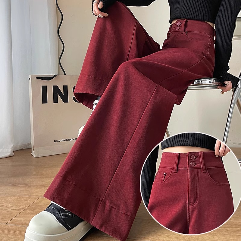 アンゴラの赤いジーパンの女性2025年の春の新型のダブルボタンの高い腰のナシの形の体つきの大きい足の大きいラッパのズボン