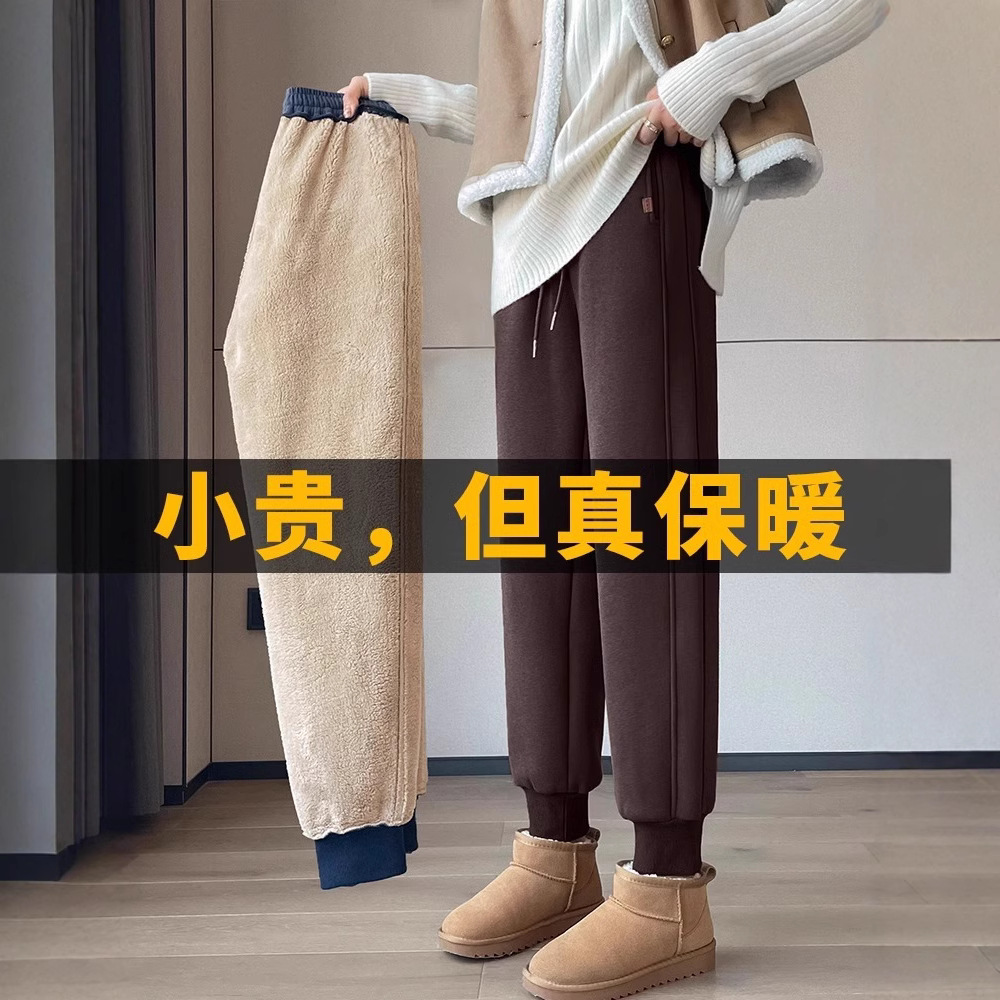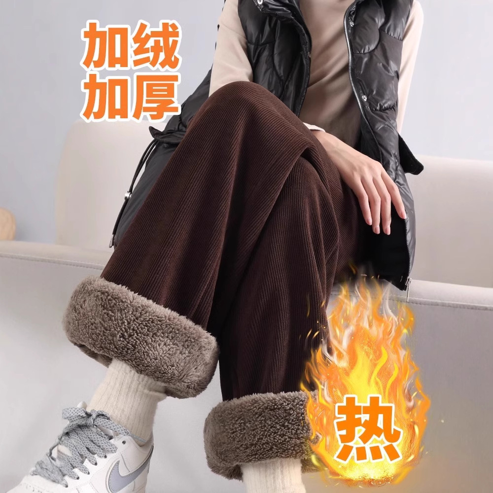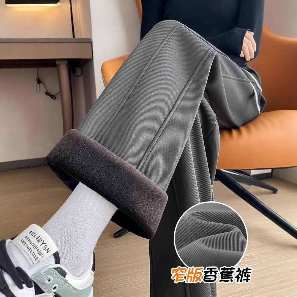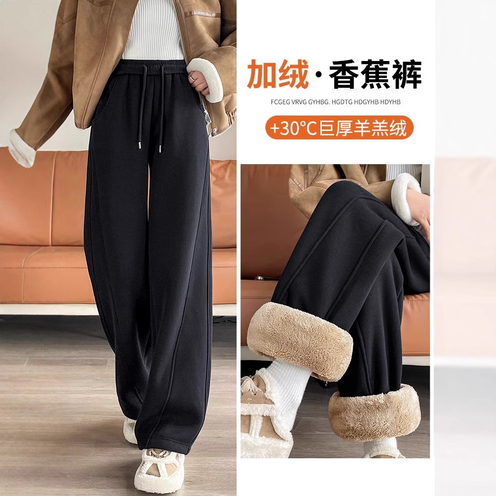 羊の小毛のズボンの女性の冬の2024の新型のまっすぐな筒の広腿のズボンとベルベットの外は綿のズボンの黒色の狭い版のバナナのズボンを着ます。