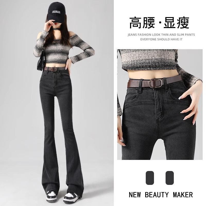 セメントの灰の微ラッパのジーパンの女性2025春秋の新型の薄い絨毛の高い腰はやせている小さい背の9分のラッパのズボンを現します。