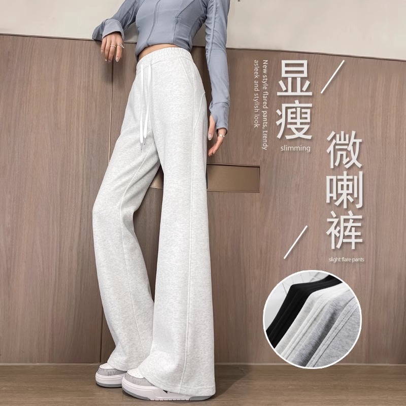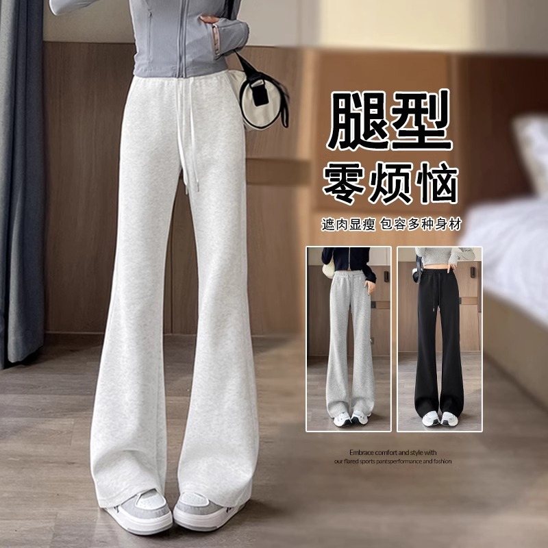 白灰色のマイクロラッパ運動ズボンの女性春秋2025の新型のベルベットの高腰の垂れ下がった感じがやせている馬蹄のラッパのズボン