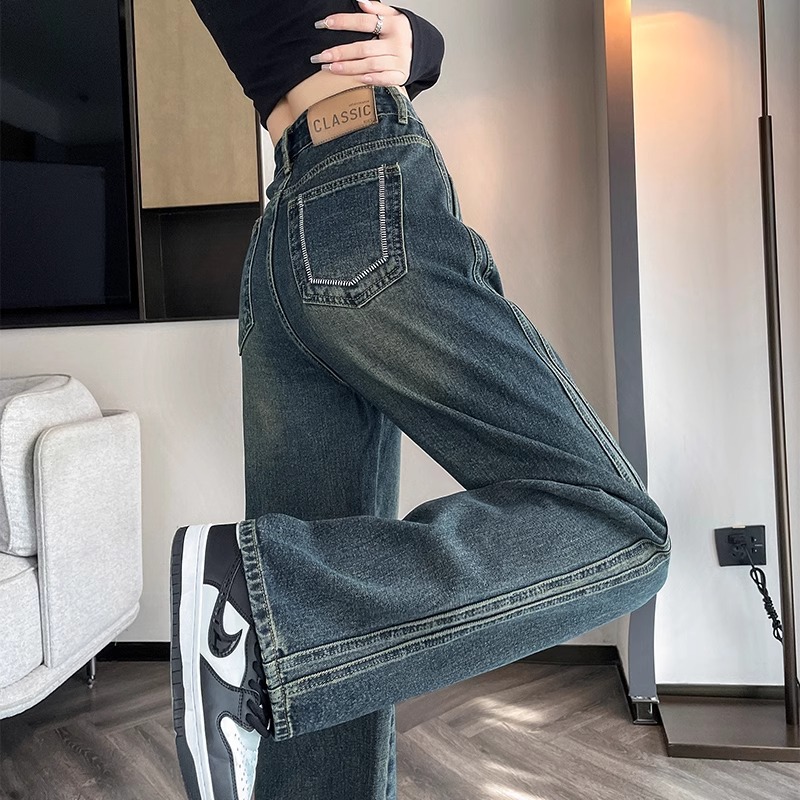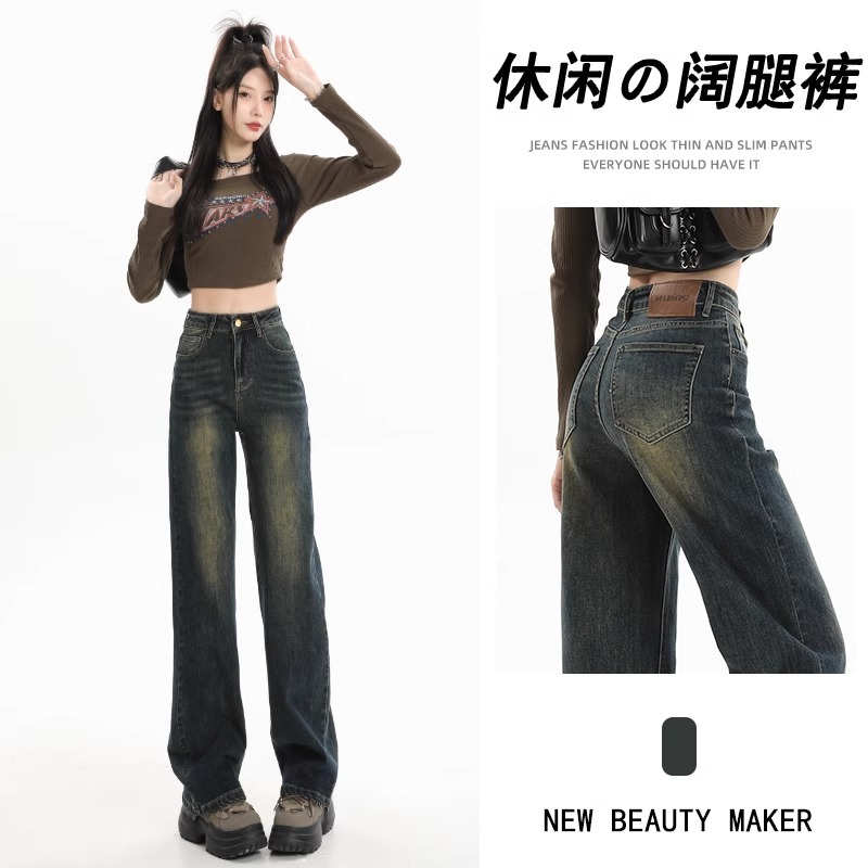 セメントの灰色のジーパンの女性の厚い2025年の春秋のまっすぐな筒の広い足の設計感の小さい大衆のアメリカ式のモップのズボン