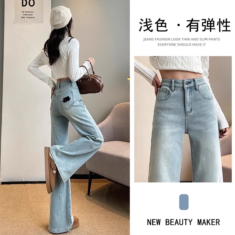 水色のマイクロラップジーンズの女性とベルベットが厚くなった2025年の春と秋の弾力性の広い文字刺繍の広脚ラッパズボン