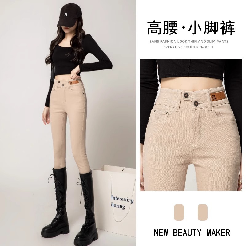 カーキ色のスキニージーンズの女性のハイウエストは冬のベルベットの足のズボンの2024の新型の鉛筆のズボンの弾力性のズボンを現します。