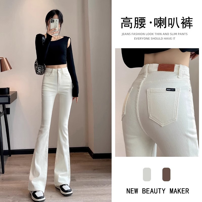 米の白いマイクロラッパのジーパンの女性の2025年の春と秋のベルベットの白い厚いラッパのズボンの小さい背の馬蹄のズボン