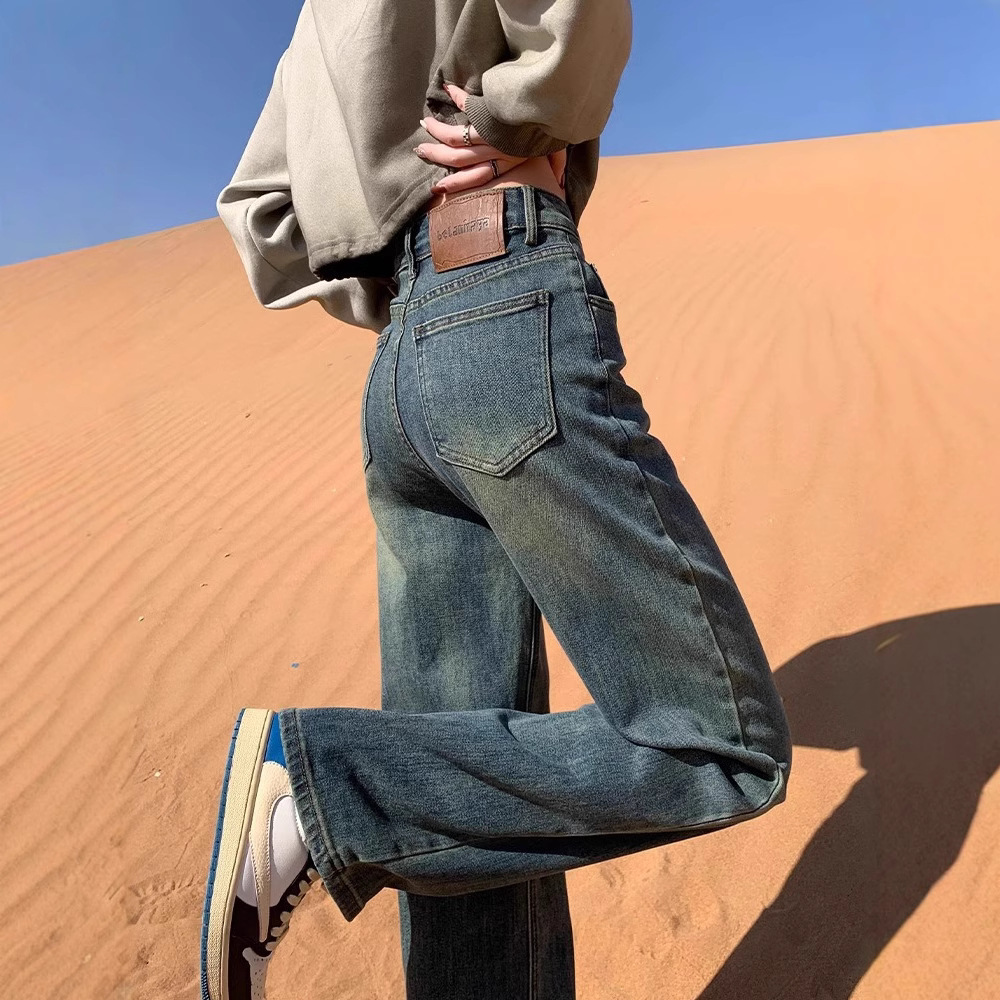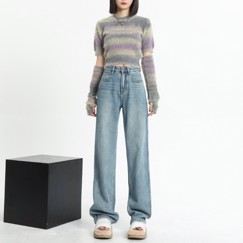 ストレートとベルベットのジーンズの女性秋冬2024年の新しいゆるい小柄な狭いバージョンの高腰広脚ズボンの子供