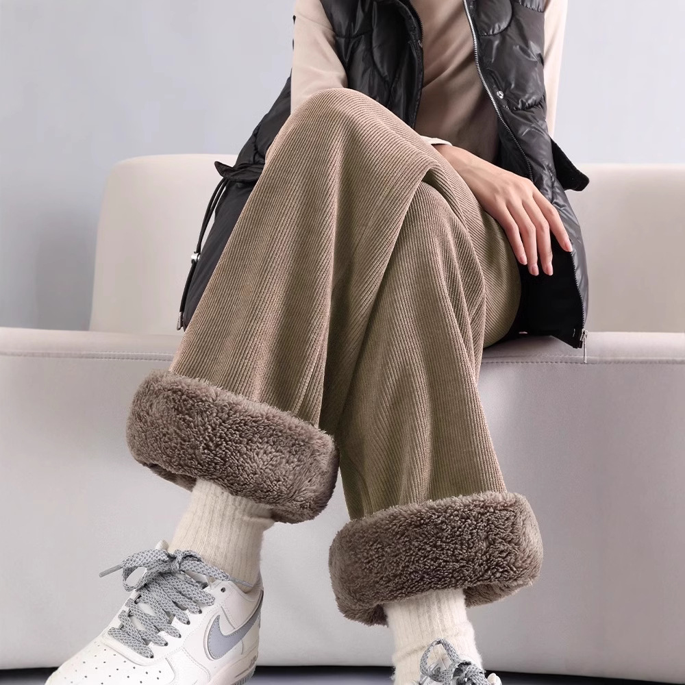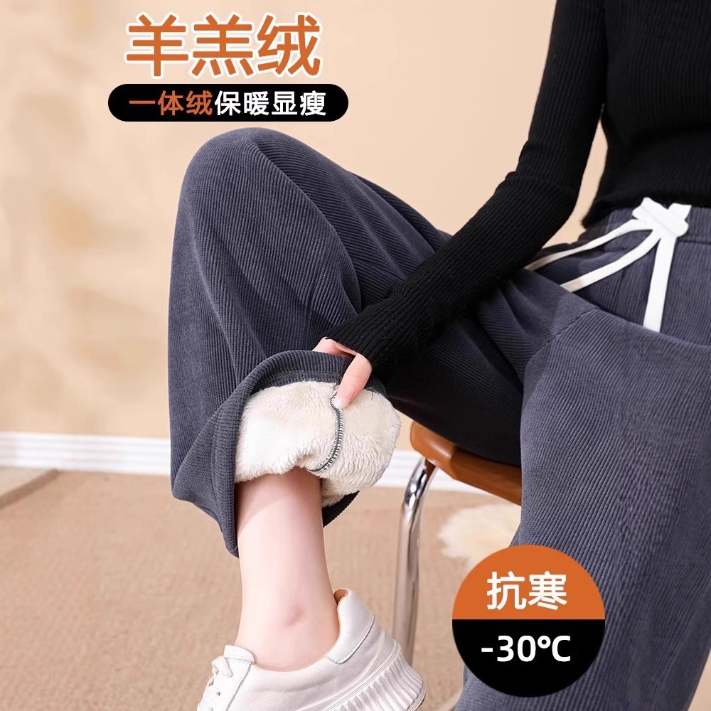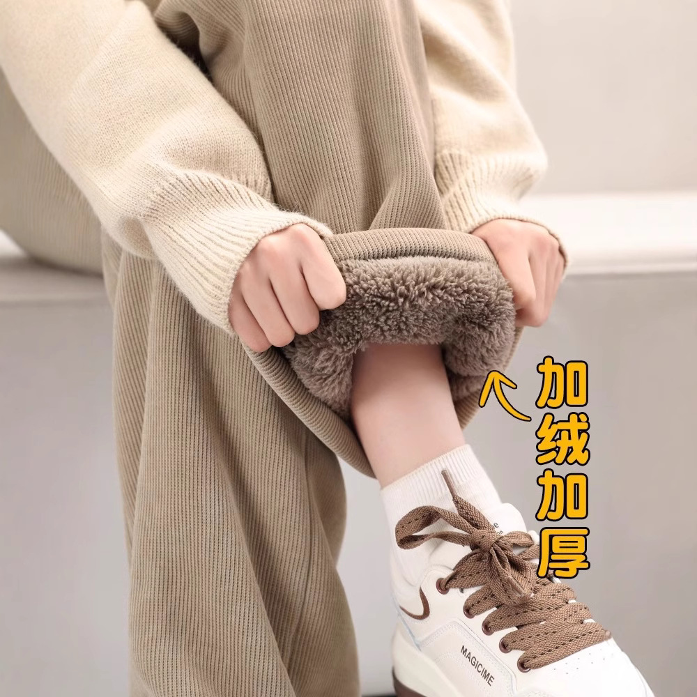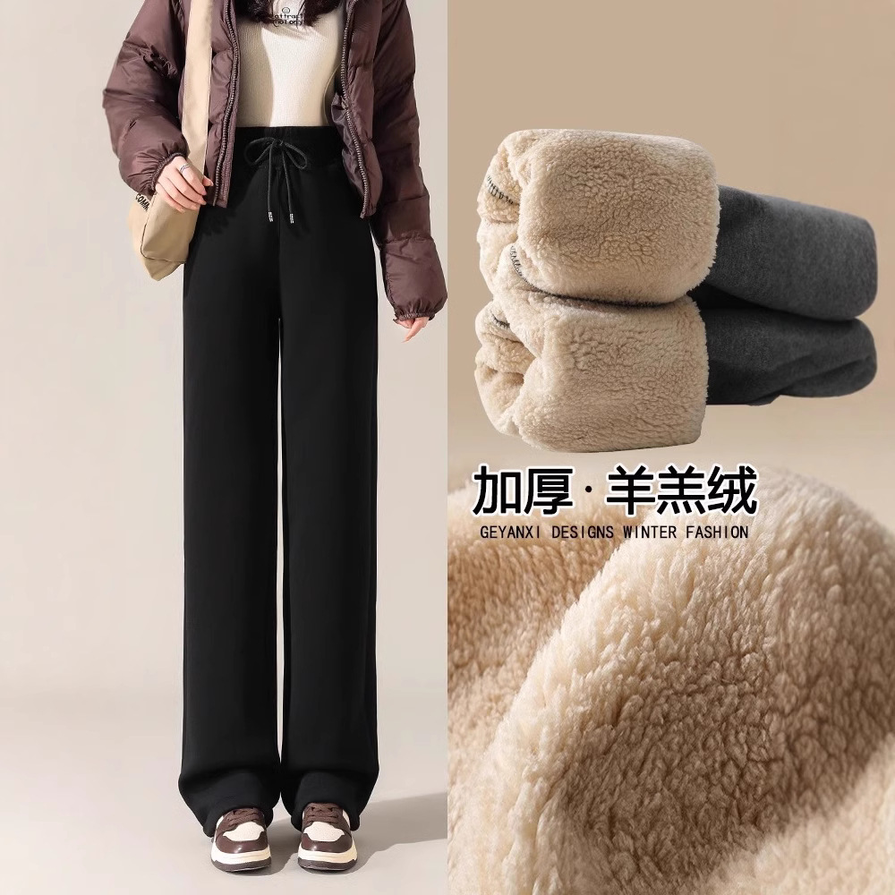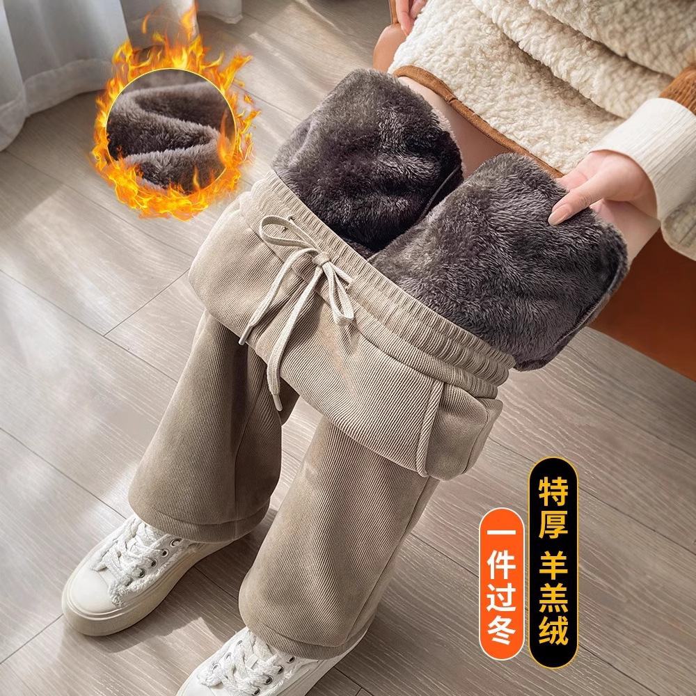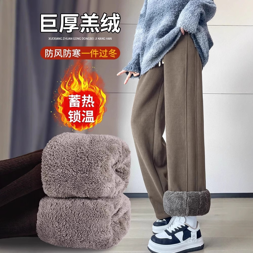 ベルベットの広脚ズボンの女性秋冬2024の新製品は東北の特厚綿ズボンの小さい子羊のベルベットのストレートパンツを着ている