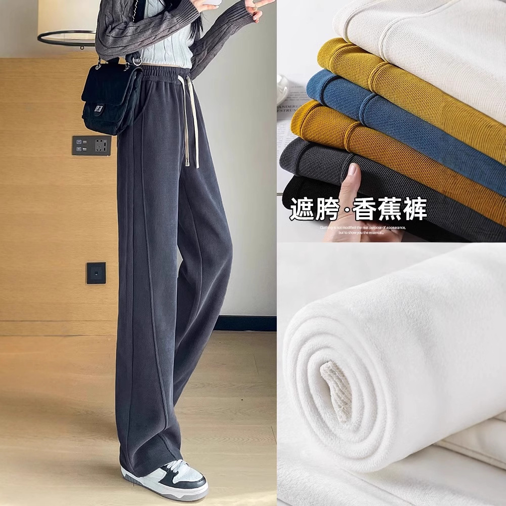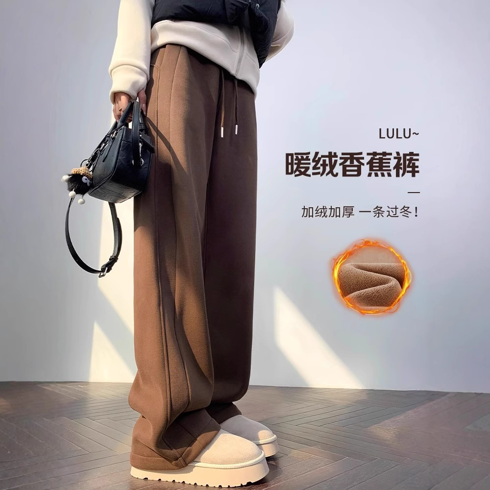 スポーツパンツ女子秋冬2024新型カジュアルハイウエストストレートワイドパンツとベルベットの外に狭いバージョンのバナナガードパンツを着ています
