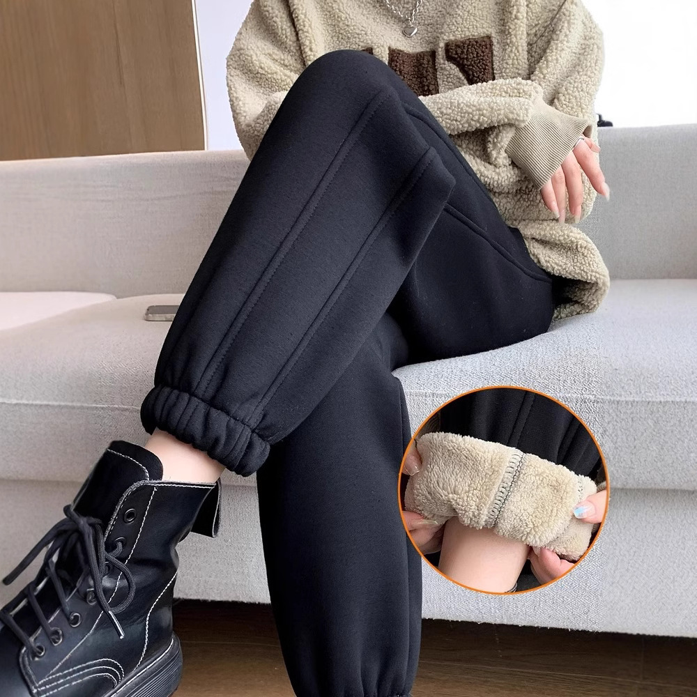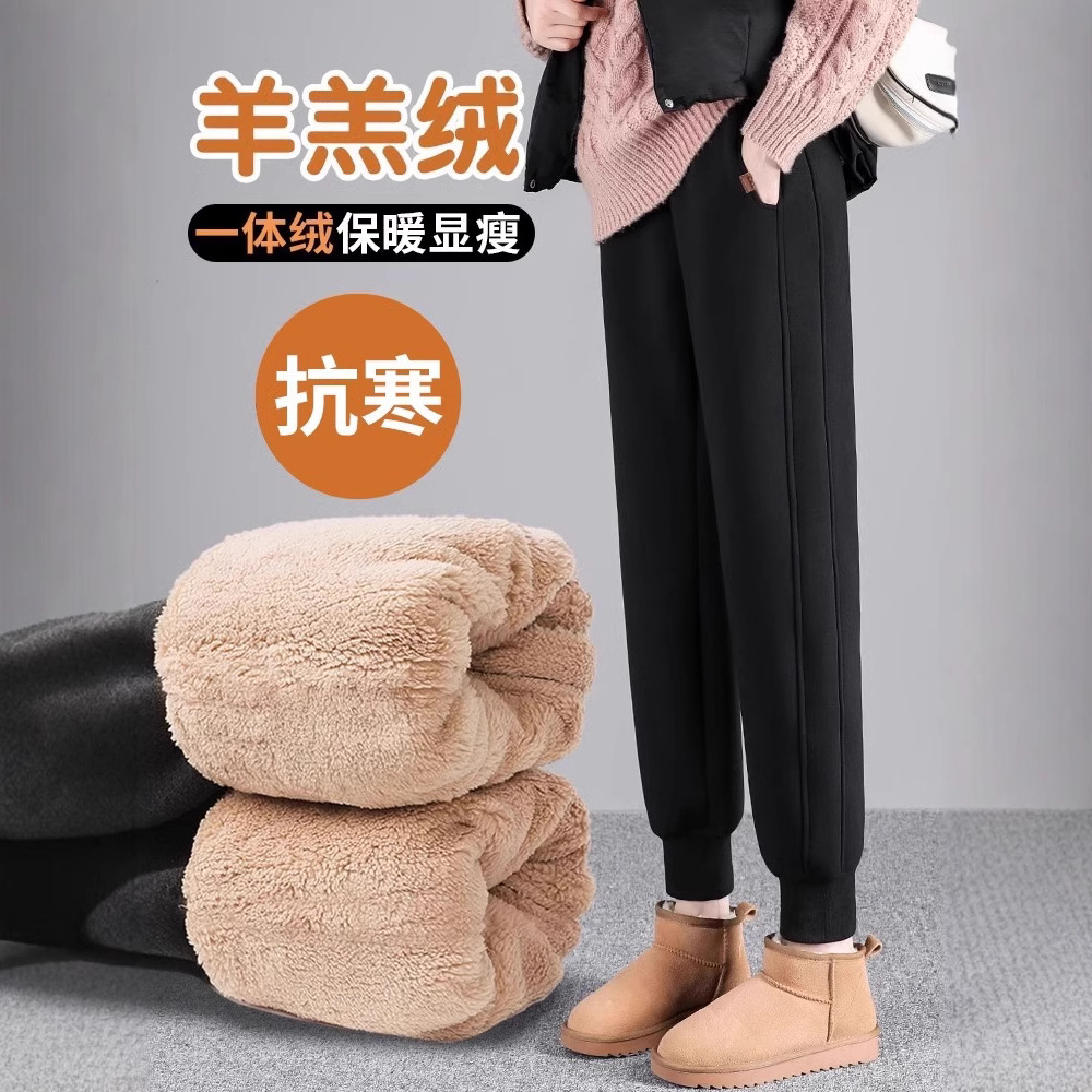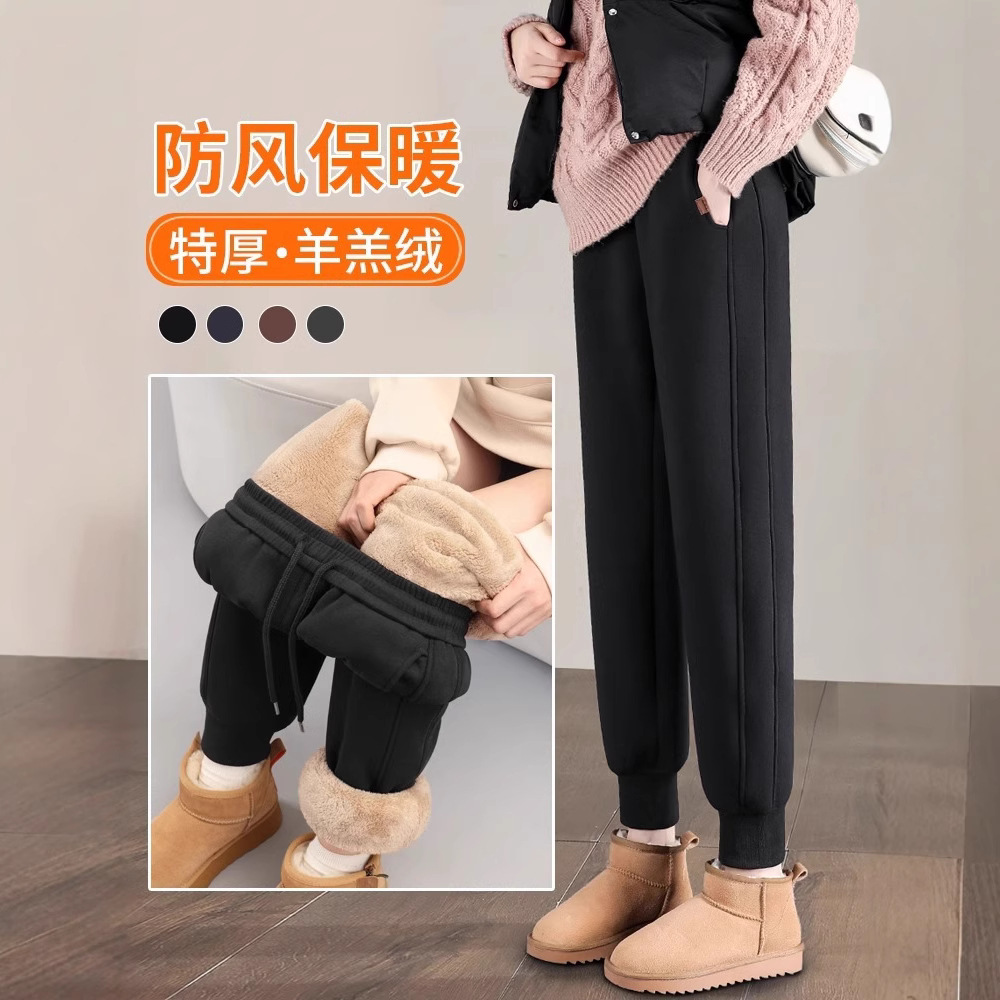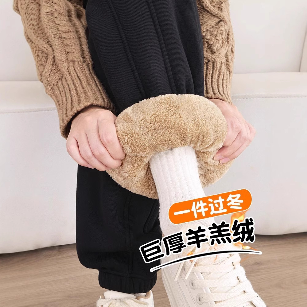 スポーツパンツの女性は冬に2024の新しいズボンにベルベットをつけて、子羊のベルベットの小柄なガーディアンパンツの外に東北綿のズボンを着ている