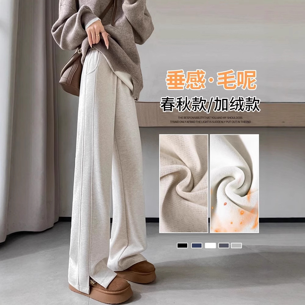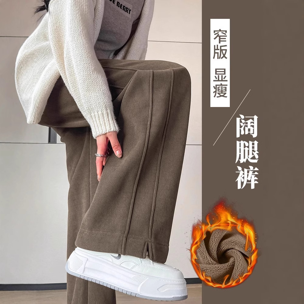 狭い版の広腿のズボンの女性の秋冬のベルベットの2024年の新型の華綿の小さい背の垂直感のまっすぐな筒のレジャーのバナナのズボン