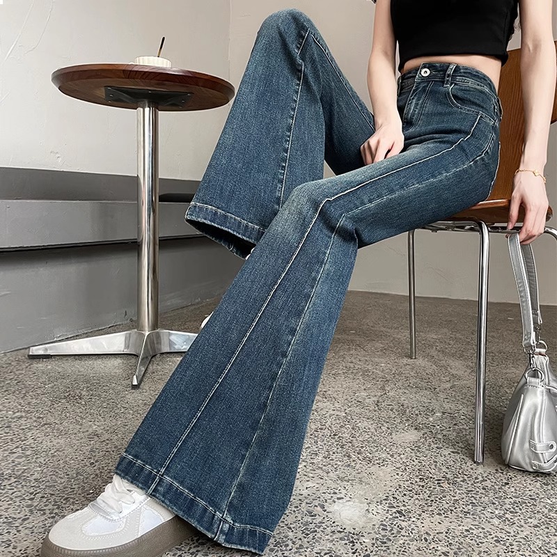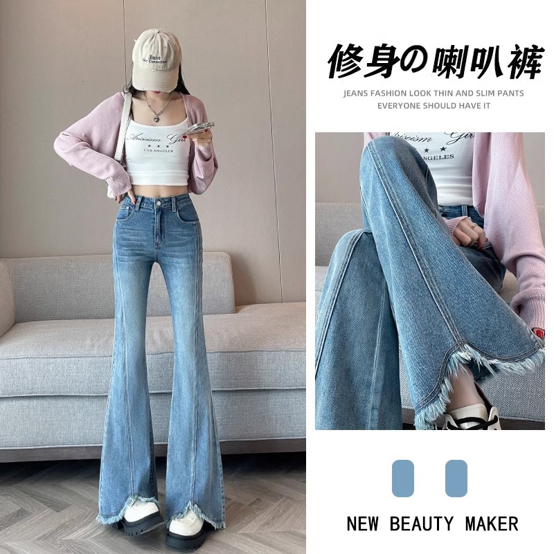 水色のフォークの毛の縁の小さいラッパのジーパンの女性の2025春の新型の修身の小さい背の馬蹄のラッパのズボン