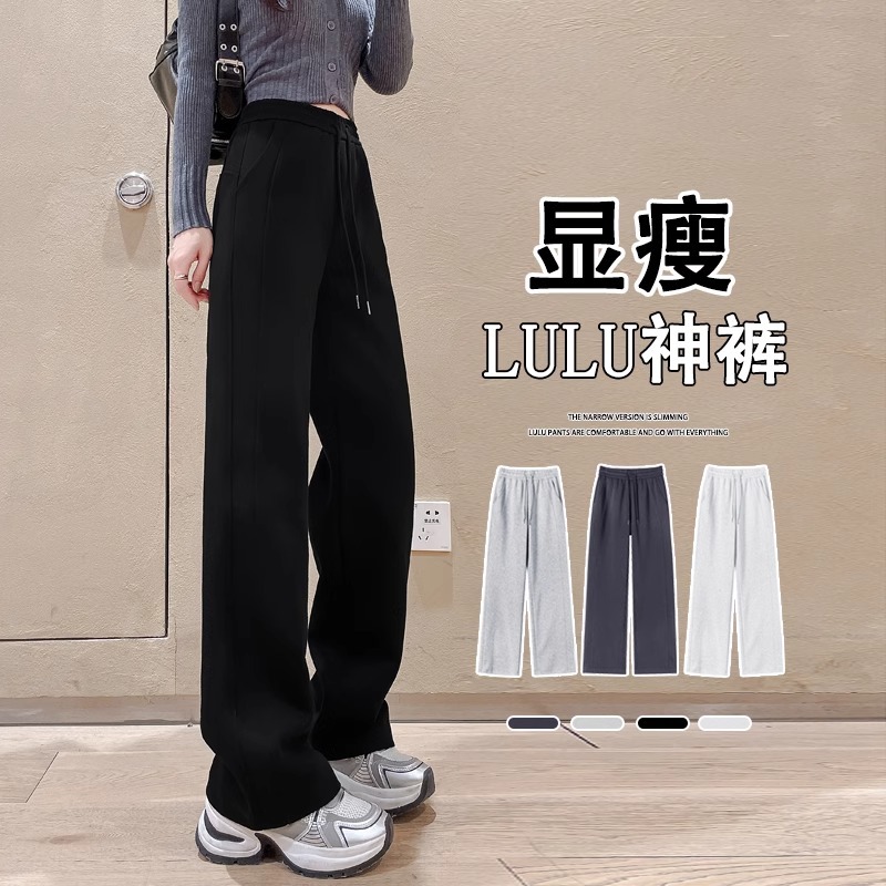 狭い版のワイドパンツの女性2025の新型の春と秋の薄いタイプはやせているスポーツのズボンのluluカジュアルなストレートのバナナのズボンを現します。