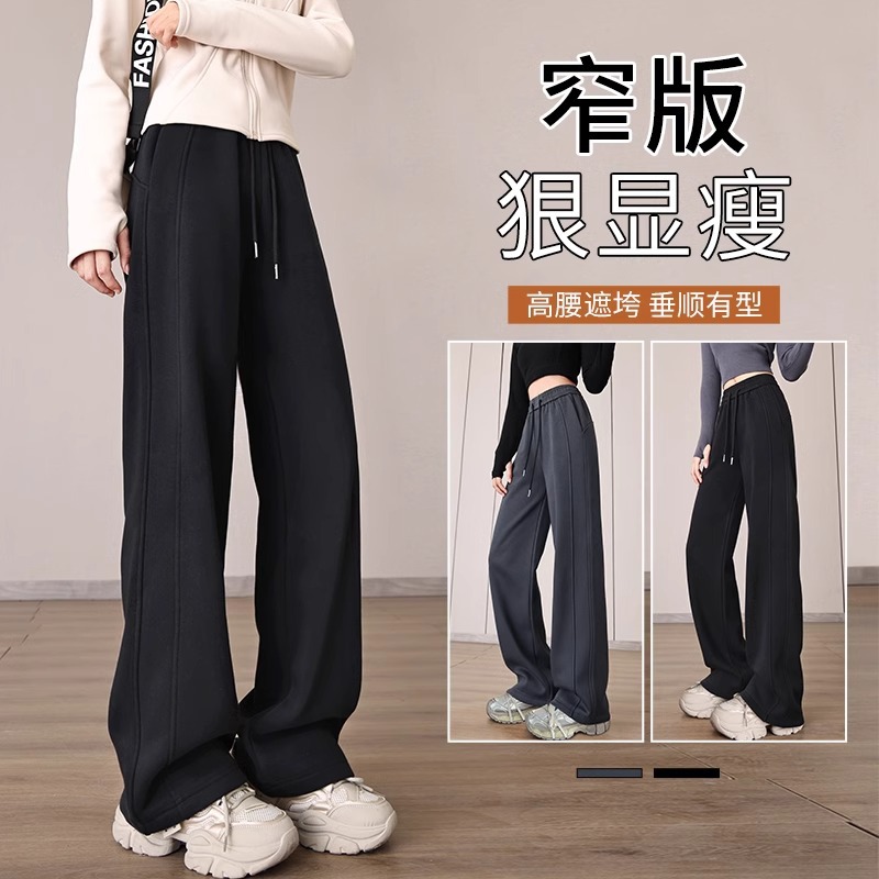 狭い版の広腿のズボンの女性の2025新型の春秋の小さい背の黒色の9分のまっすぐな筒のカジュアルなズボンの垂直感の運動の衛のズボン