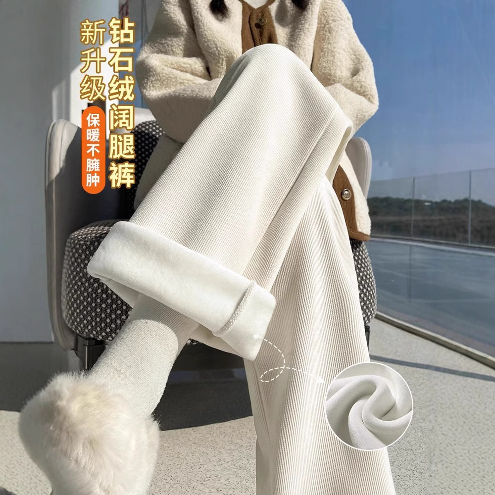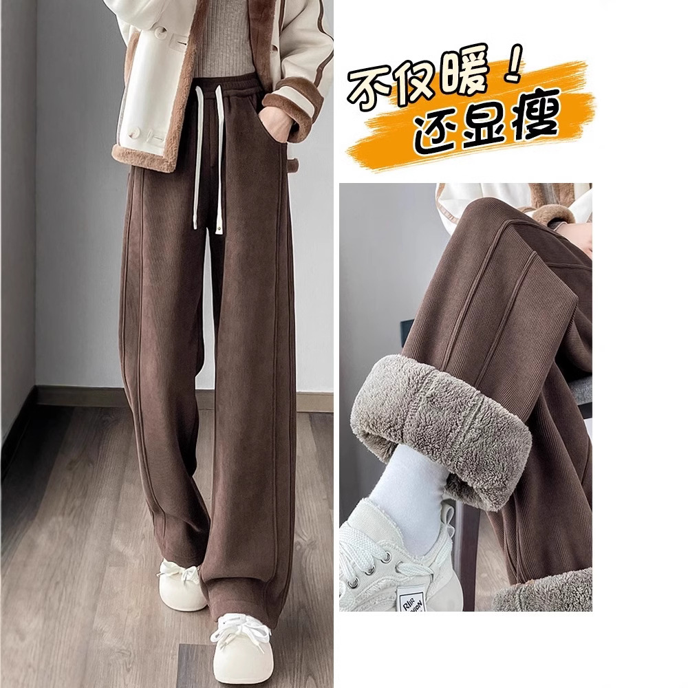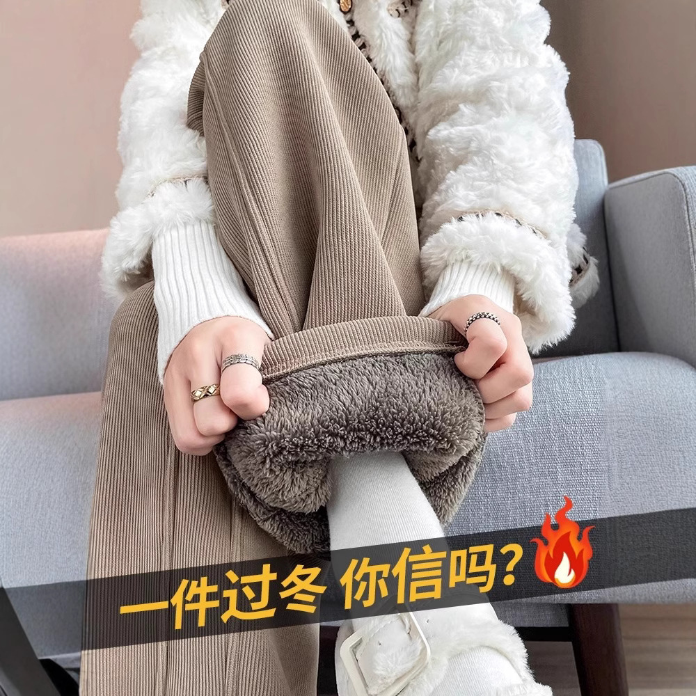 狭い版の羊の小毛の広脚のズボンの女性の2024秋冬のベルベットの垂れ下がった感じの厚い保温の東北の綿のズボンの外はまっすぐな筒のズボンを着ます。