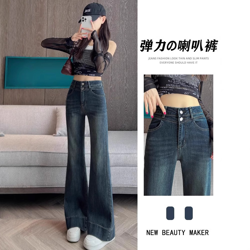 レトロな広脚春秋マイクロラップジーンズの女性2025年にベルベットが厚くなった小さな弾力的な馬蹄ラッパズボン