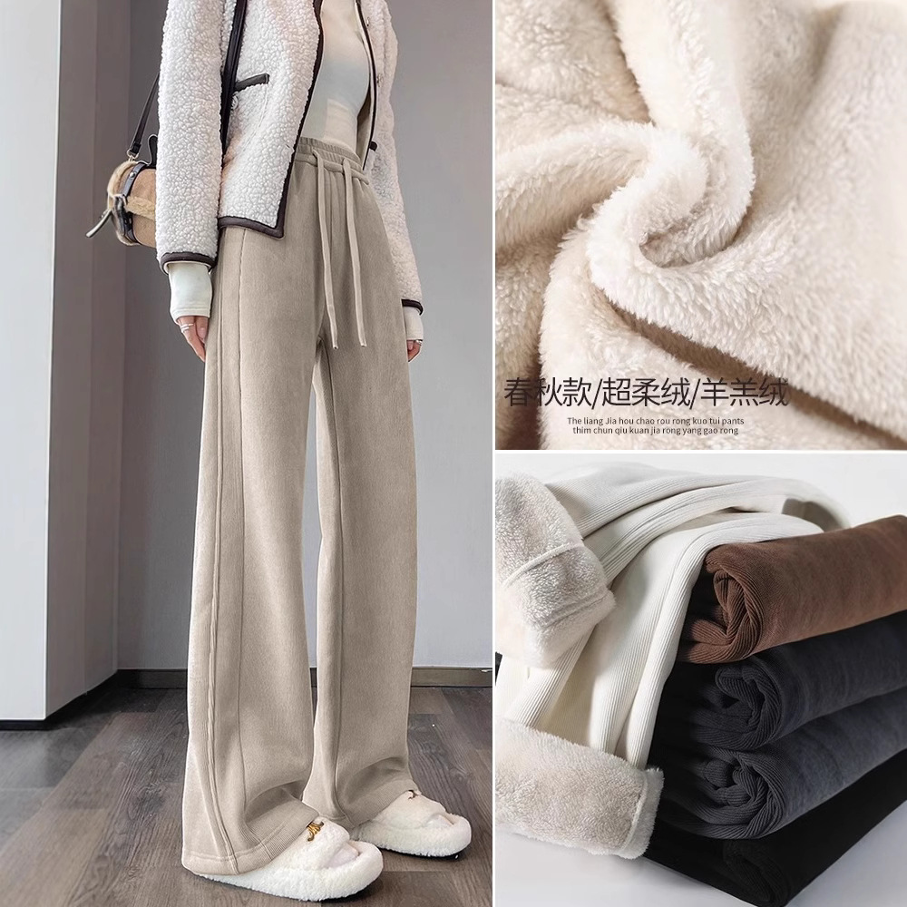 子羊の毛の狭い版の広腿のズボンの女性の秋冬のベルベットの2024の新型の欧綿の絨毛の高い腰のカジュアルなまっすぐな筒のバナナのズボン