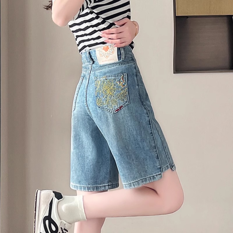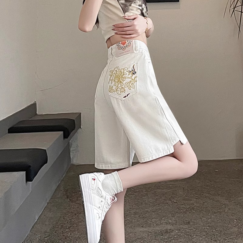 ホワイトナショナルトレンド刺繍クォーターデニムショートパンツ女性用2025夏薄いスリットデザインルーズワイドレッグミッドパンツ