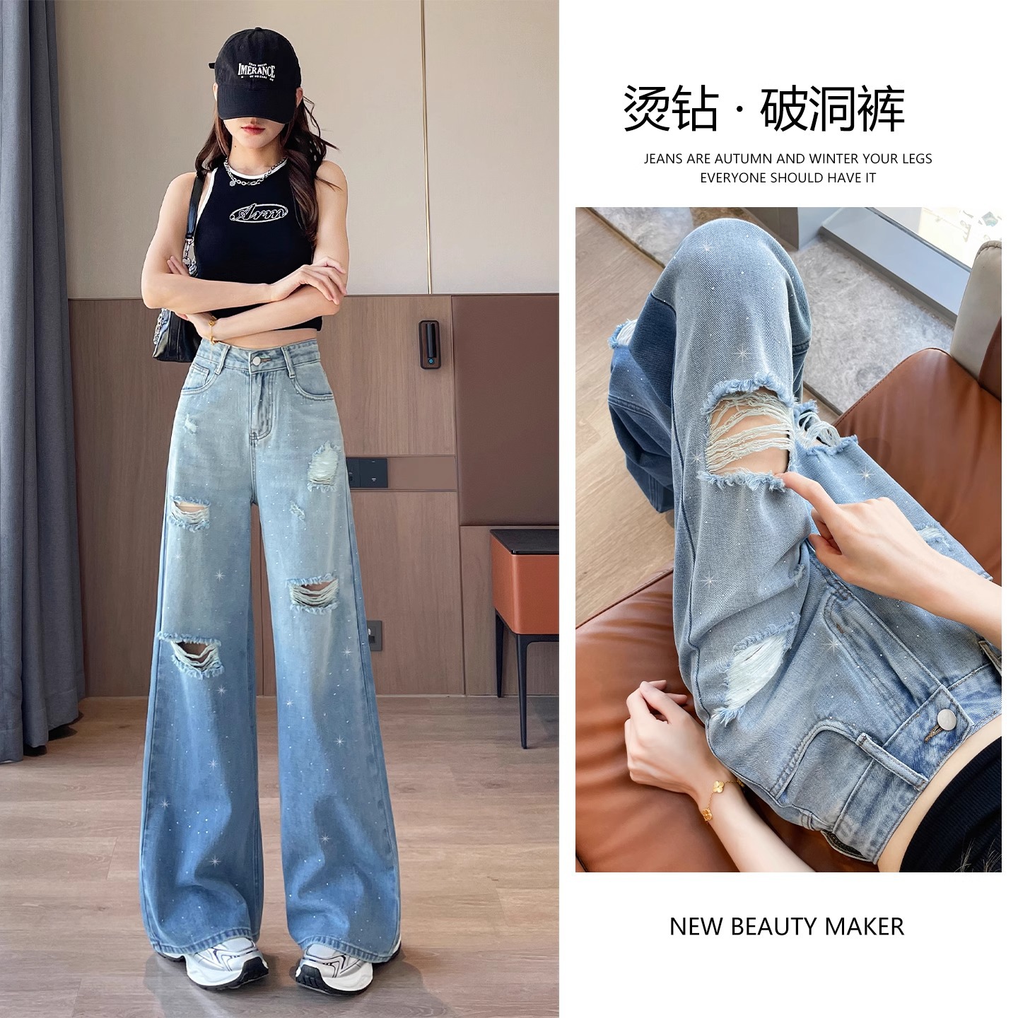 女性用ホットドリルリップドジーンズ2025夏薄いハイウエストスリムドレープグラデーションカラーワイドレッグパンツストレートパンツ