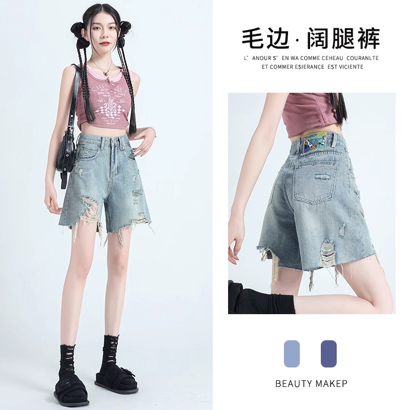 女性用ホットドリルリップドデニムショートパンツ2025春夏新作ハイウエストルーズストレートホットガールワイドレッグ5点パンツ