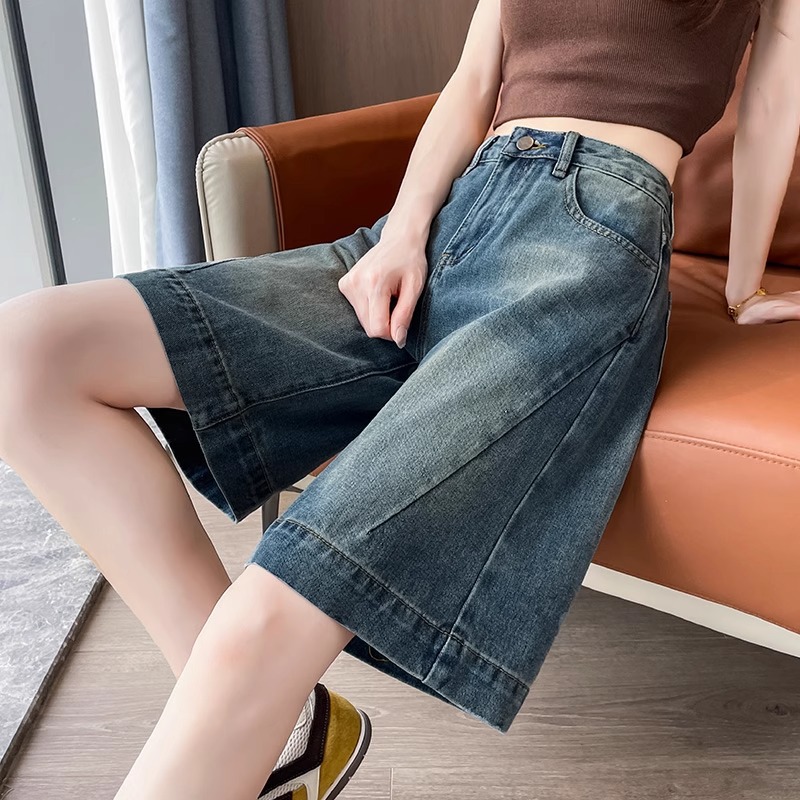 女性用5点ワイドレッグデニムショートパンツ2025夏薄手ゆったり股間カバー肉感ストレート5点ミッドパンツ