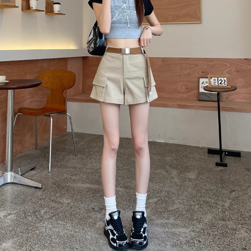 アプリコットアメリカンワークウェアデニムショートパンツ女性用2025夏薄いAライン大きなポケット弾性ルーズ3点ホットパンツ