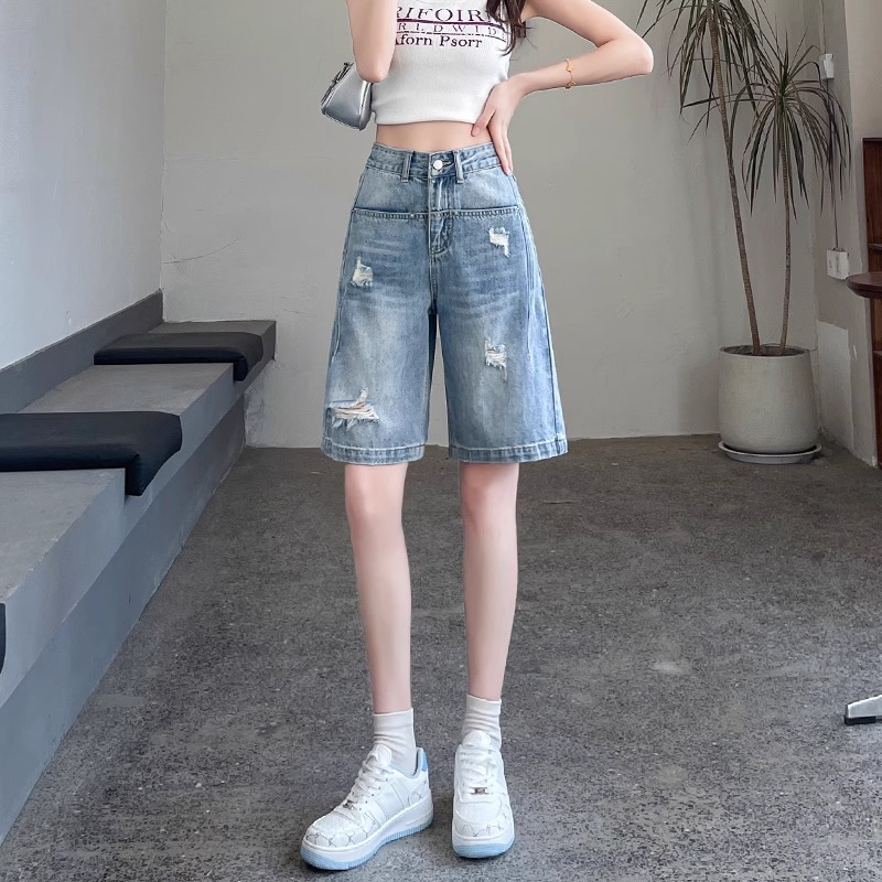 女性用5点破れデニムショートパンツ2025夏薄手ゆったり痩身Aラインワイドレッグ5点ミッドパンツ