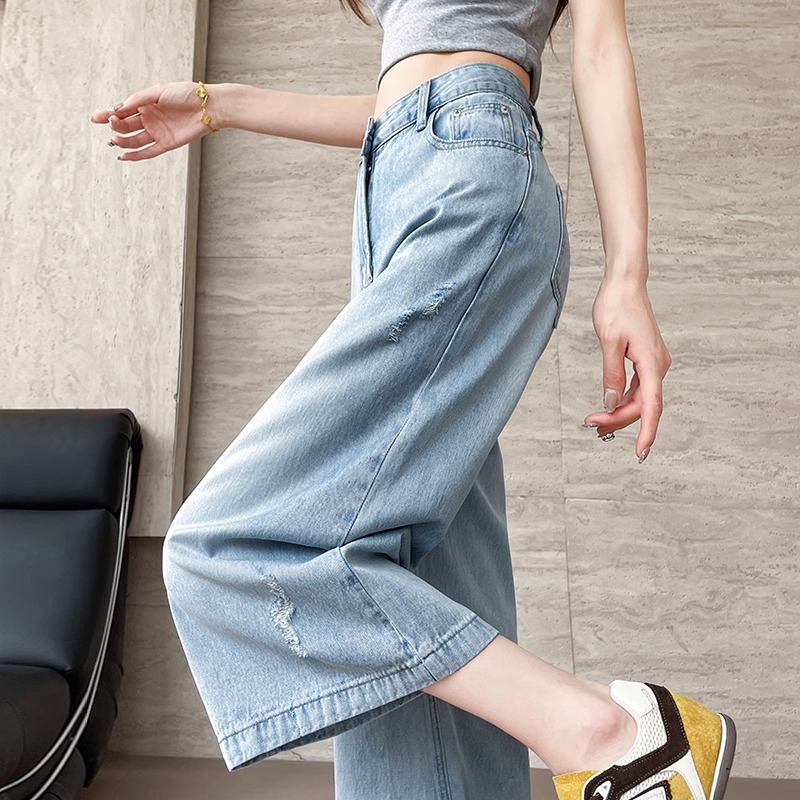 テンセルワイドレッグジーンズ女性用 2025 夏薄手ルーズワイドレッグほつれ穴あき 7/8 膝丈パンツ