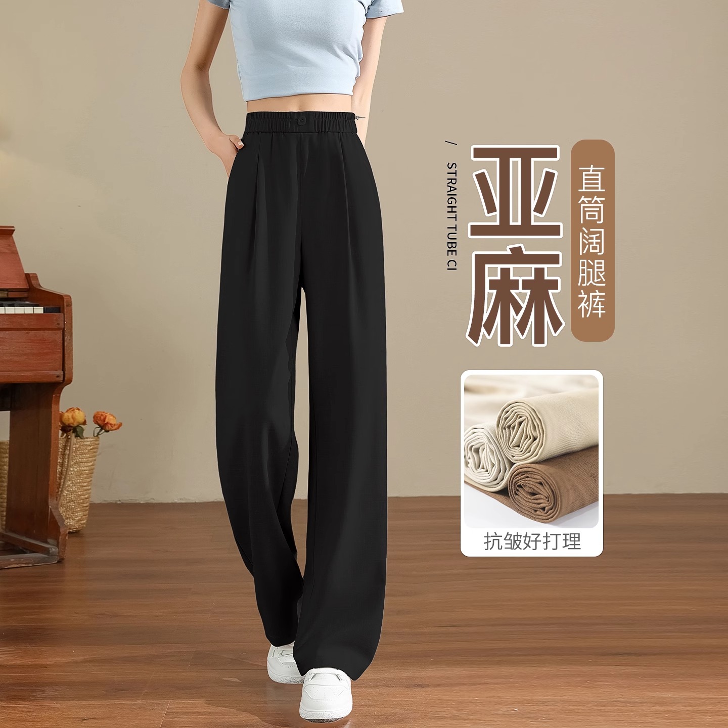 女性用ブラックリネンワイドレッグパンツ、夏用軽量アイスシルクドレープストレートコットンとリネンパンツ、小柄な人向けのナローバージョン、山本パンツ
