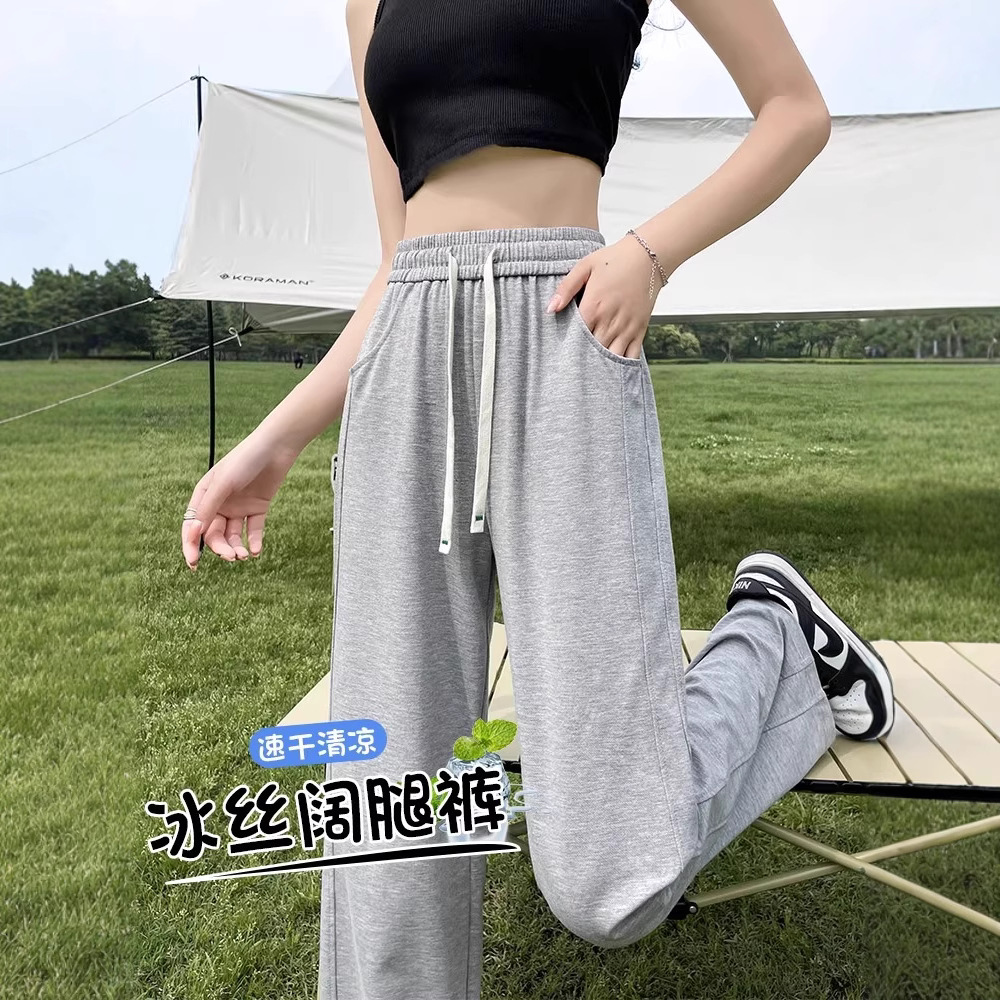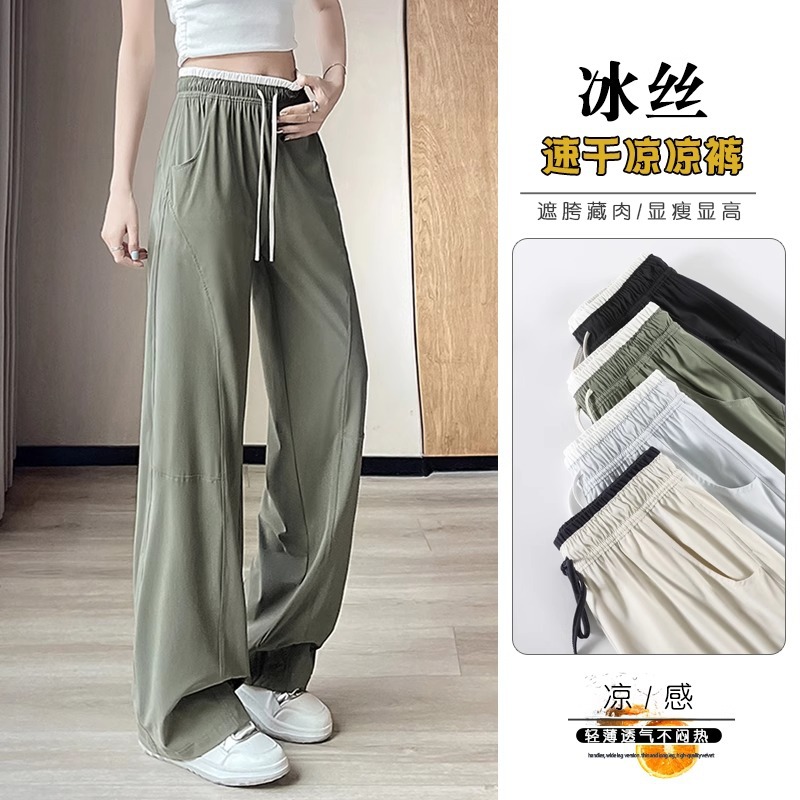 速乾性スポーツパンツ女性の夏薄い 2025 新しいスタイル小柄なドレープハイウエストルーズアイスシルククールワイドレッグパンツ