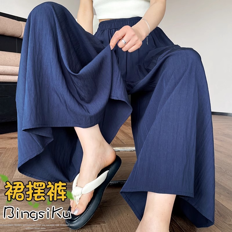 ネイビーブルー山本ワイドレッグパンツレディース夏薄手2025新作ルーズストレートリネンアイスシルククールカジュアルパンツ