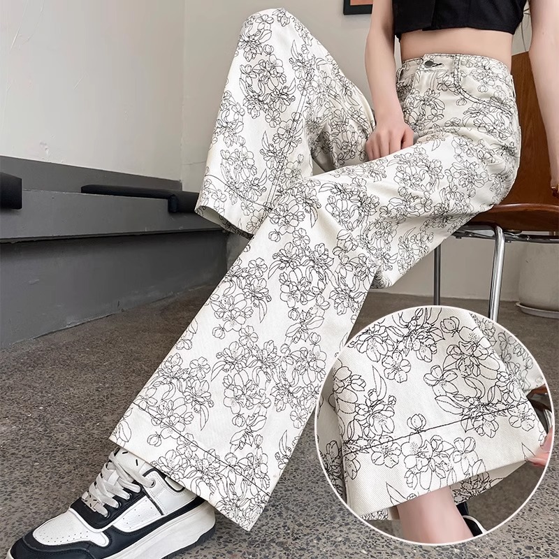 Guochao デジタルプリントジーンズ女性のための 2025 夏薄い水墨画パターンナローバージョンストレートワイドレッグフロアレングスパンツ