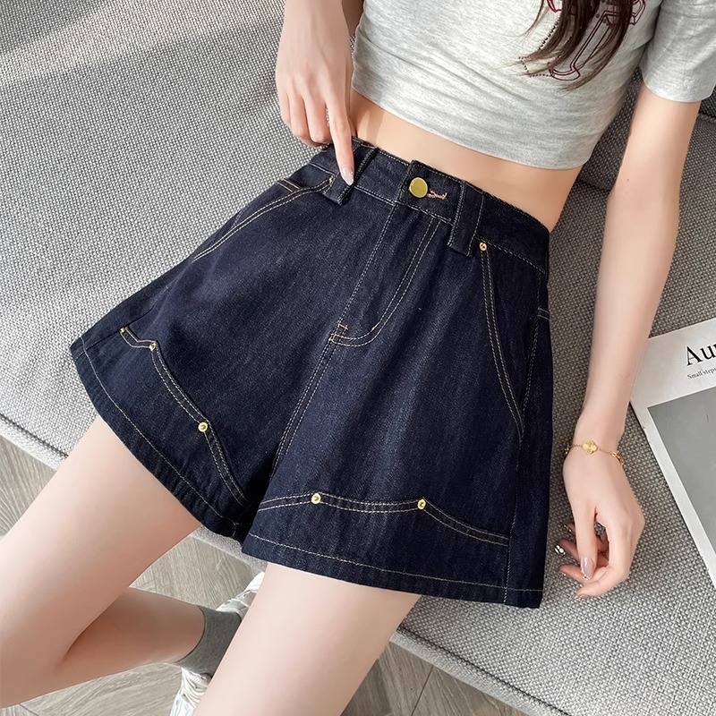 デニムブルーデニムショートパンツ女性のための 2025 夏ハイウエストアメリカンレトロ A ラインワイドレッグトップステッチコントラストリベットホットパンツ