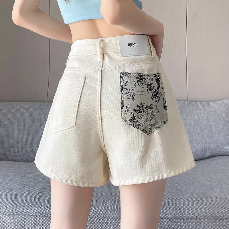 アプリコットデニムショートパンツ女性用2025夏薄いハイウエスト小柄オフホワイト中国風プリント3点ホットパンツ