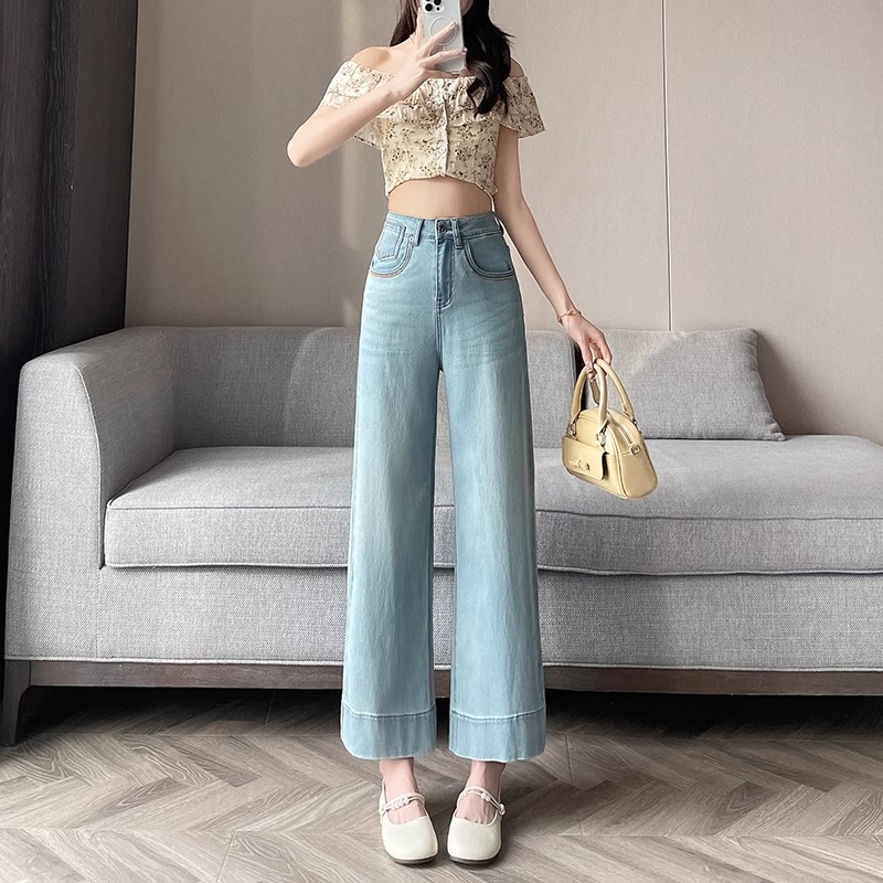 女性用ホワイトワイドレッグジーンズ2025夏薄いダブルボタン小柄な人向け、ゆったりしていて脚にフィットしない、大きなフレアスカート