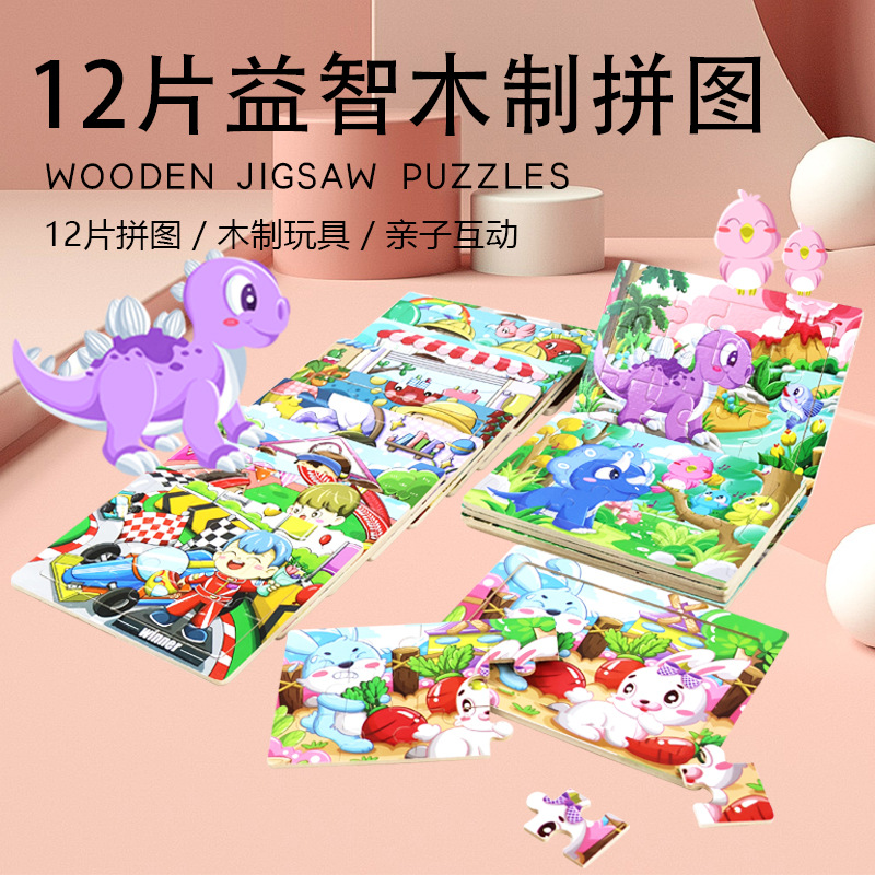 木製の12枚の平面パズルの子供の知育のおもちゃの早教の漫画の動物の認知の論理の思惟のつづり合わせ