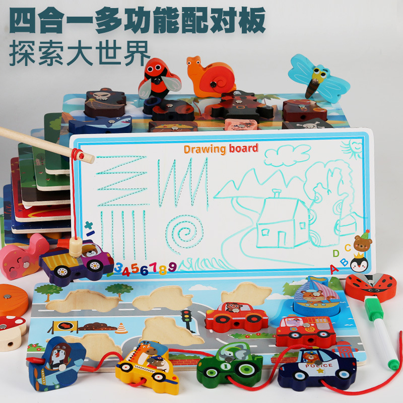 子供の木製四合一多機能ペアボード萌え面白い図案大粒積み木ビーズ早教知育玩具