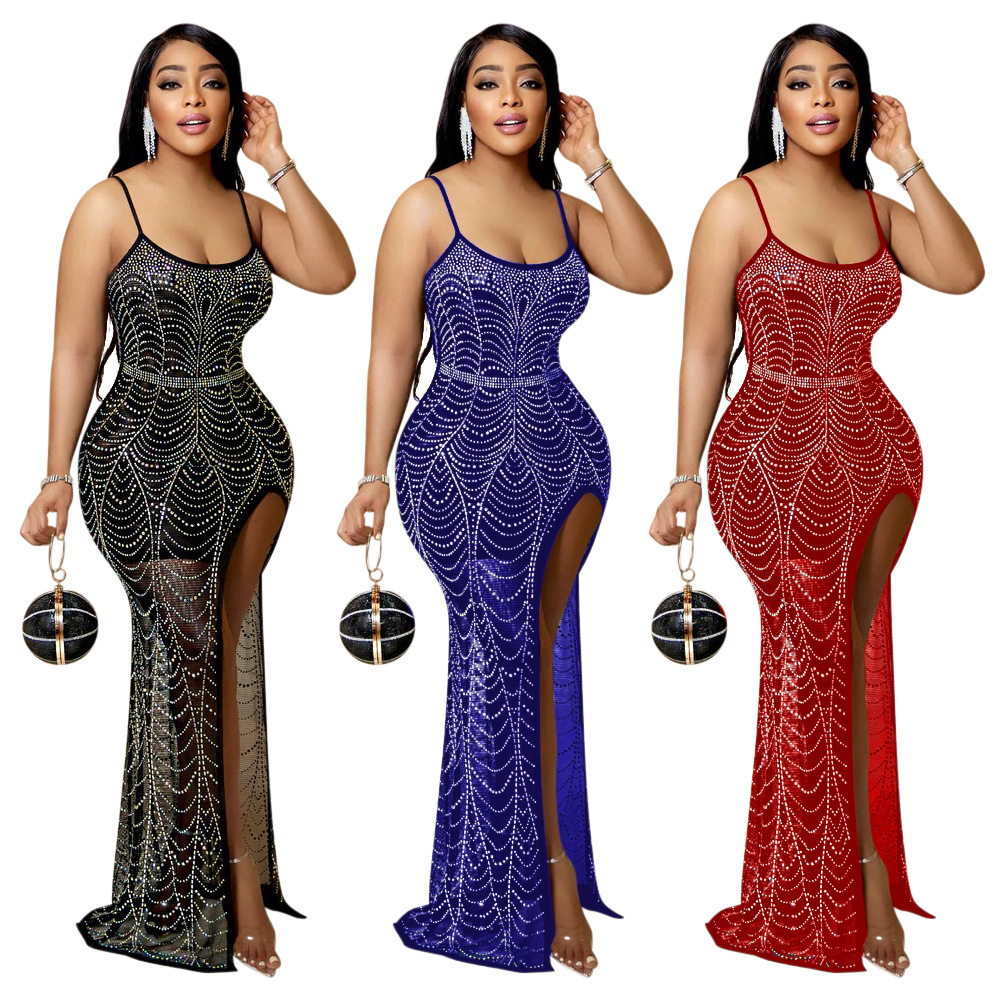CY9832 ヨーロッパとアメリカの AliExpress ファッションセクシーなサスペンダーホットダイヤモンドスリット露出脚ホットダイヤモンドドレス宴会セレブスタイル