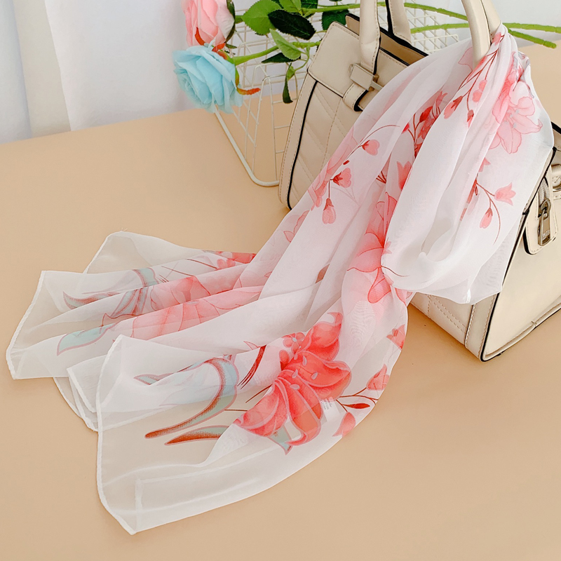 2024春と秋の新型プリントの白いシルクタオルの狭い長さの夏の日焼け止めビーチのガーゼと韓国のマフラーの女性