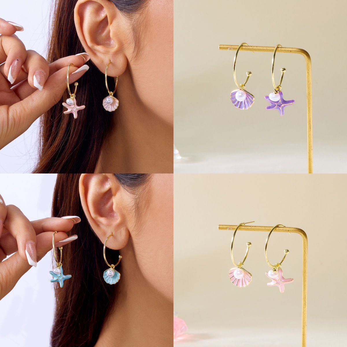 クロスボーダー新しいスタイルの小さな新鮮なオーシャンシェルイヤリングファッショナブルなオイルドリップパールコンクシェル非対称イヤリング