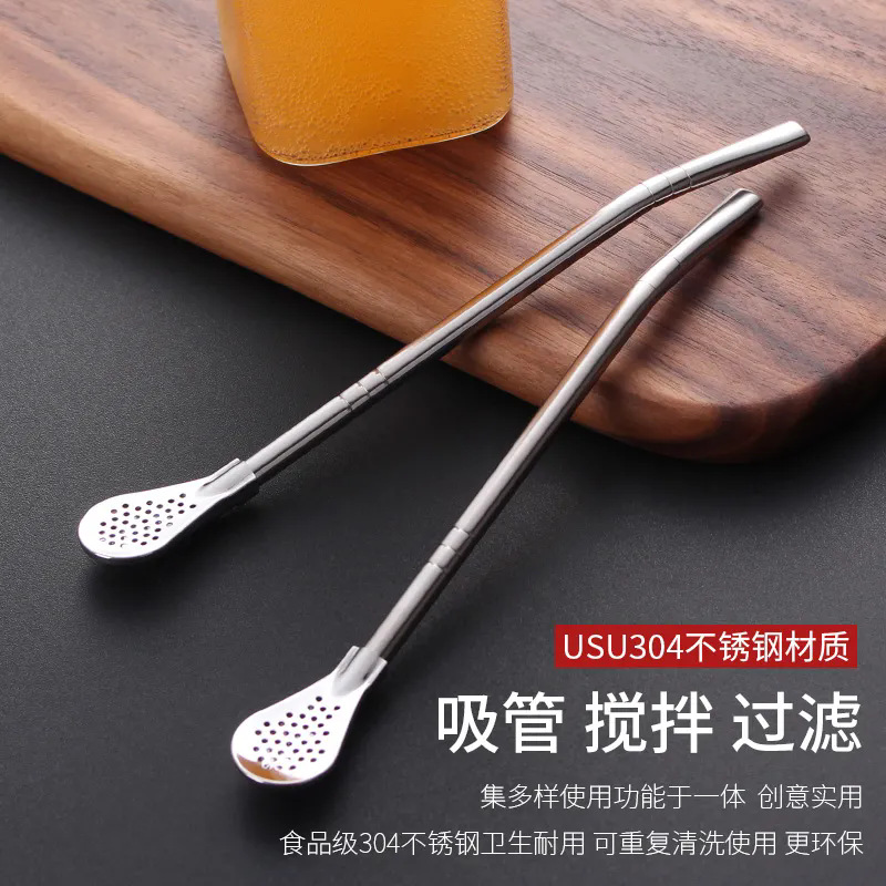 304 ステンレス鋼ストロースプーンデュアル目的クリエイティブコーヒー撹拌スプーン環境に優しいストロージュースミルクティーフィルターストロー