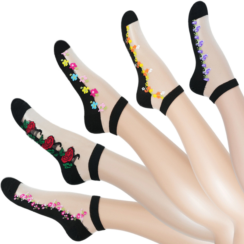 欧米の爆発物の女性の中筒の水晶の肉のストッキングの春夏の薄い金の刺繍のガラスのシルクの女性の靴下の滑り止めの靴下