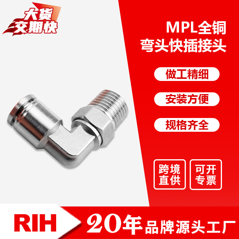 Rih瑞亨mpl継手銅メッキニッケルエルボ継手pl全銅外ねじ90度直角気管クイックプラグ