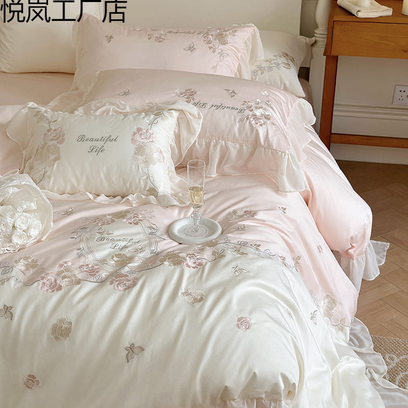 フレンチロマンティックガールハート100番手純綿4点セット花柄刺繍入り掛け布団カバー純綿起毛1.8寝具