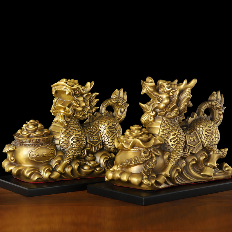 真鍮の麒麟のペアの聚宝盆旺財麒麟金属工芸品の家庭装飾品の聚財銅置物の卸売り