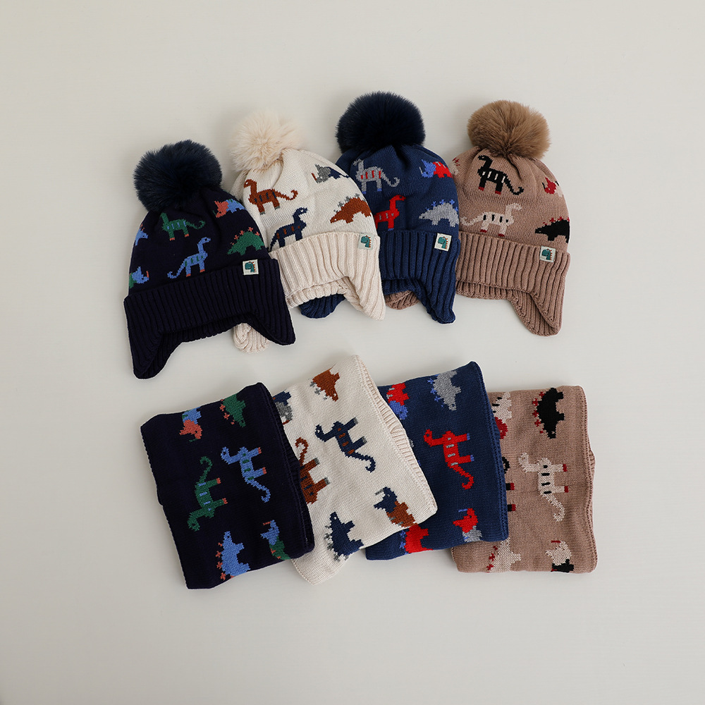 小恐竜冬児童毛糸帽男女童ニット頭耳保護帽パイル保温帽子マフラー2点セット