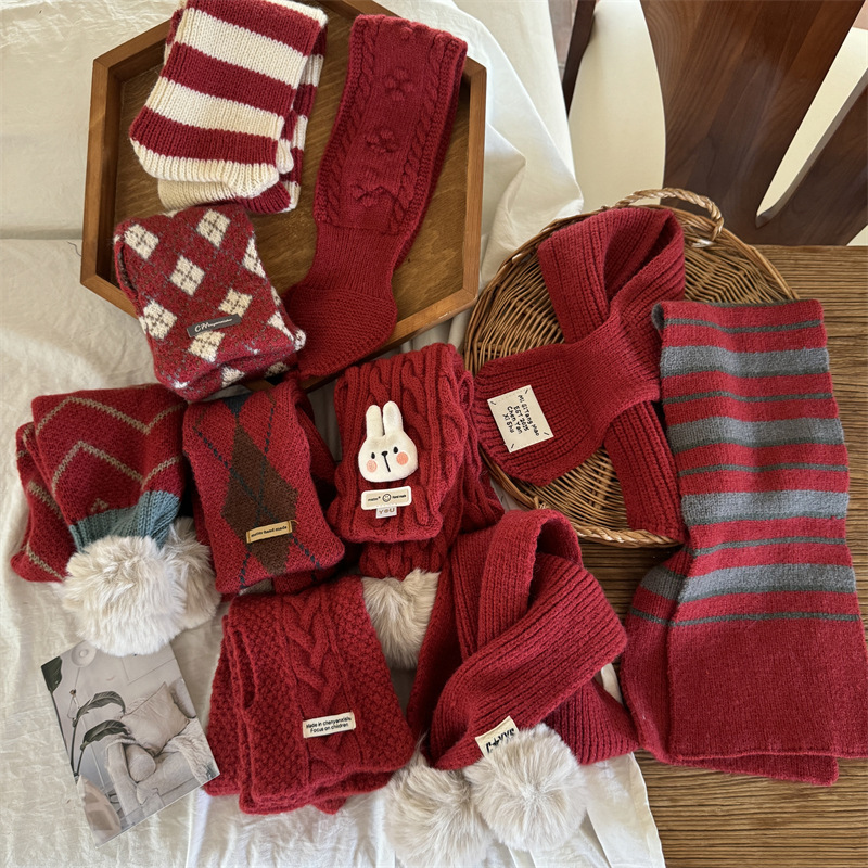 新年の赤い赤ちゃんが首を囲んで冬の新年の洋風ニット保温子供のお祝いの男女がクリスマスのマフラーを着ている