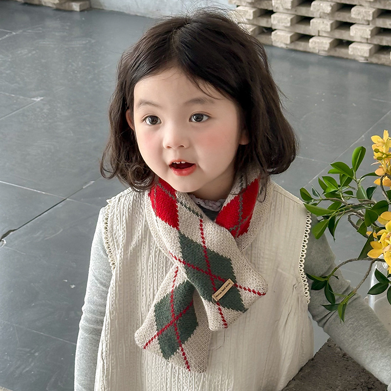 レトロ菱格子供用マフラー秋冬新型保温防風幼稚園マフラー